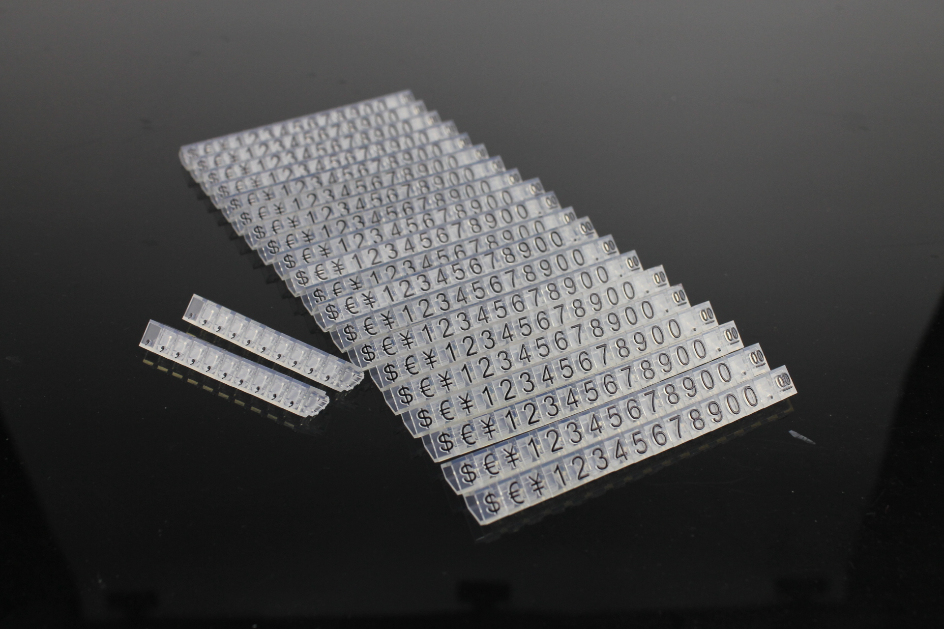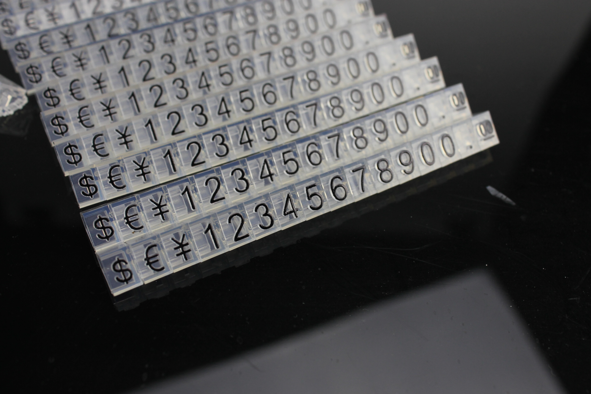 Wprowadzenie »Cenówki» Plastikowe cenowki czarne, przezroczyste 6x9mm €,$,¥ 20 rząd