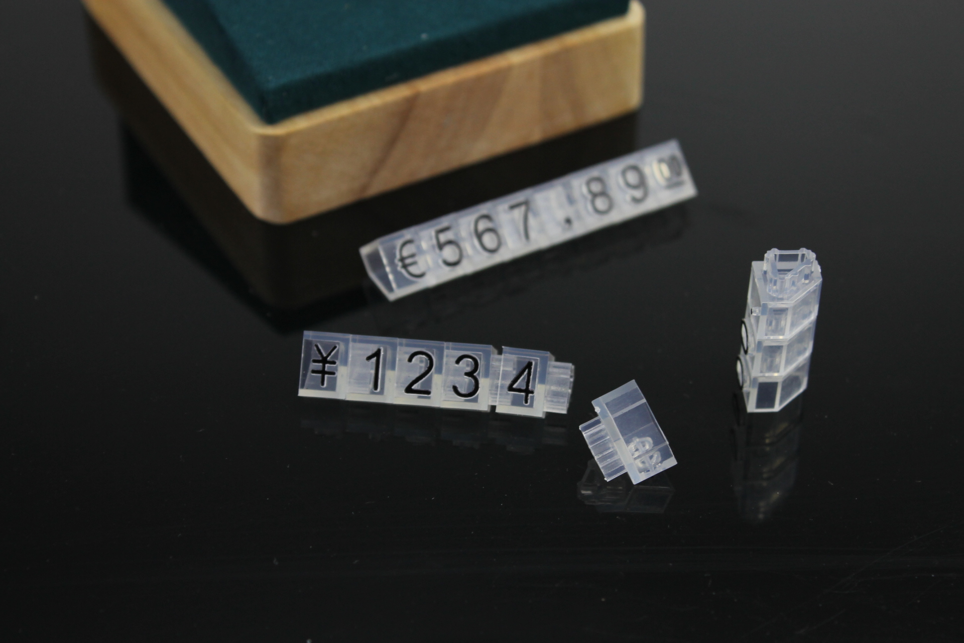 Plastikowe cenowki czarne, przezroczyste 6x9mm €,$,¥ 20 rząd